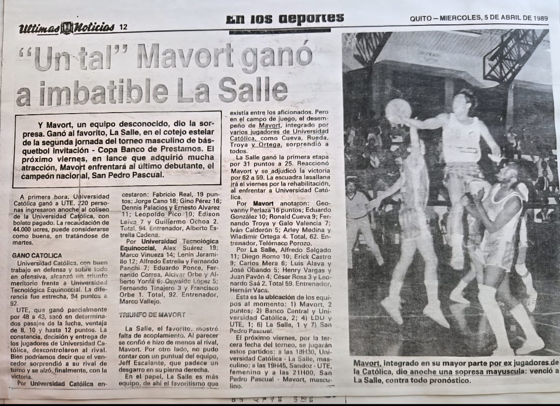 Al Club Mavort lo fundé, junto con otros ex jugadores de Universidad Católica en mayo de 1989. Como club legalmente constituido, pudimos jugar en el Torneo Preparación de Pichincha 1989. Salimos sorteados para jugar nuestro primer partido del torneo contra el Club La Salle, en ese entonces el equipo más fuerte de Pichincha, que contaba con jugadores de la selección de Ecuador, como Jeff Escalante, Diego Romo, José Obando, Franklin Nazareno, Alfredo Salgado y era ampliamente favorito para imponerse sobre este nuevo club Mavort, que lo integrábamos principalmente exjugadores de Universidad Católica. El equipo de Mavort alineó con Iván Calderon, Ronal Cueva, Fernando Troya, Geovanny Perlaza y Wladimir Ortega. Fue un gran partido, al descanso del primer tiempo el equipo de La Salle sacó una ventaja de 10 puntos. En la segunda parte, el Club Mavort reaccionó y fue descontando la ventaja y en una emocionante final ganó el partido por 3 puntos. Fue algo inesperado y causo gran alegría a los miembros de Mavort, creo que fue la buena estrella con la que nació el club. La anécdota de esta victoria se da al día siguiente del partido, pues el diario Ultimas Noticias de Quito, publicó en grandes titulares el resumen de ese partido, bajo el título de: “UN TAL” MAVORT GANÓ A IMBATIBLE LA SALLE. Fue un resultado sensacional para un club que nacía: Mavort.
