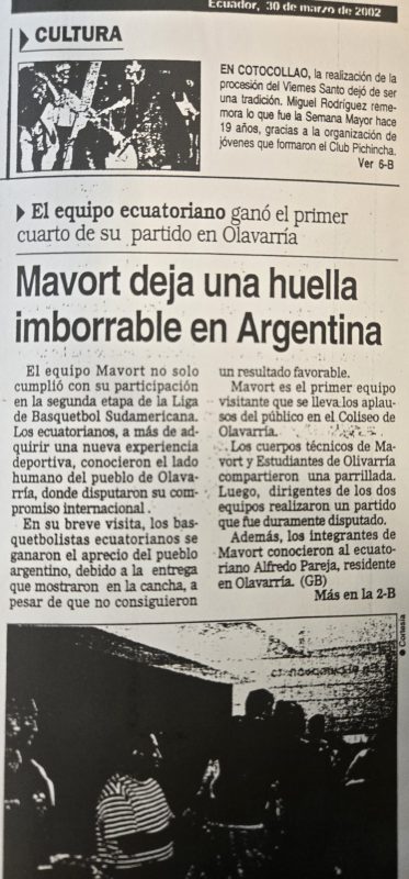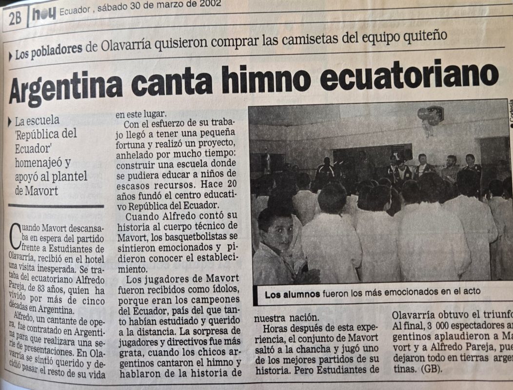 Cuando llegamos a Olavarria, en nuestro hotel, llega una delegación de la Escuela Republica del Ecuador, que coincidentalmente ha existido en esa ciudad, el rector de la escuela, el señor Alfredo Pareja, nos invita para que el Club Mavort, en su calidad de campeón ecuatoriano visite la escuela. Aceptamos gustosamente y al llegar a la escuela, nos llevamos la grata sorpresa de que todo el plantel de estudiantes y profesores estaba formado en el patio principal y al llegar el Club Mavort, cantaron el himno nacional de Ecuador. Todos quienes estuvimos presentes, nos llenamos de emoción y orgullo de ser ecuatorianos.